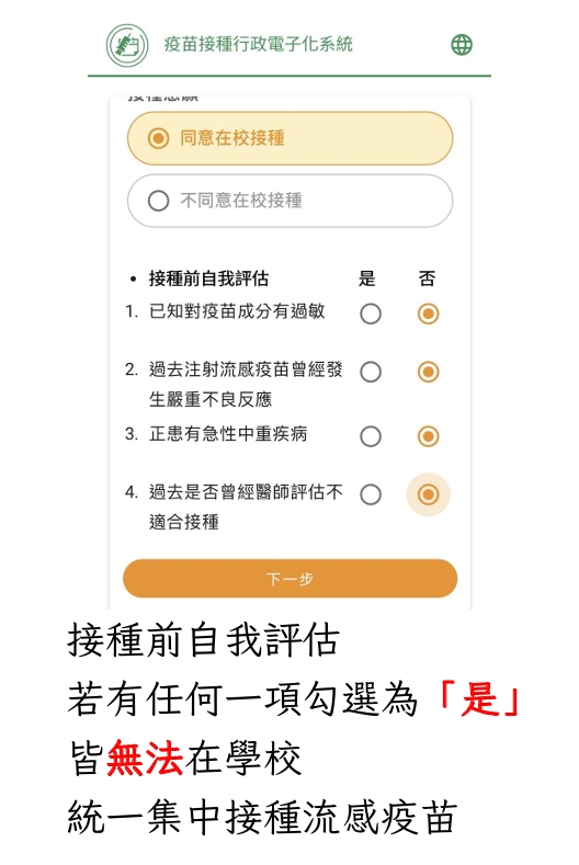線上填寫截止日期:114年10月13日23:59。請於期限完成填寫作業,時間內未完成意願填寫視同【不同意】在校接種流感疫苗。
