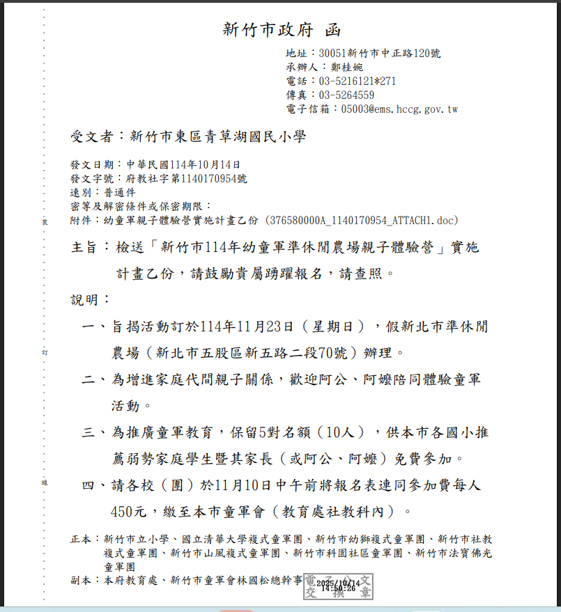 一、參加對象 : 本市幼童軍、幼女童軍及本市各國小中、高年級學童暨其樂齡長輩,並保留5對名額(10人),供弱勢家庭學生暨其家長(或阿公、阿嬤)免費參加。