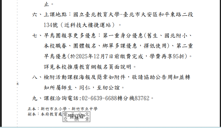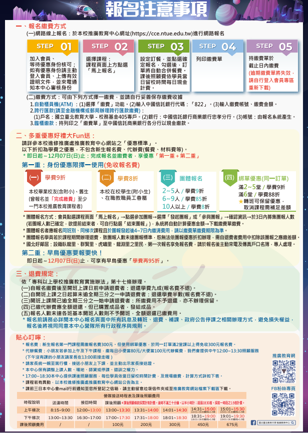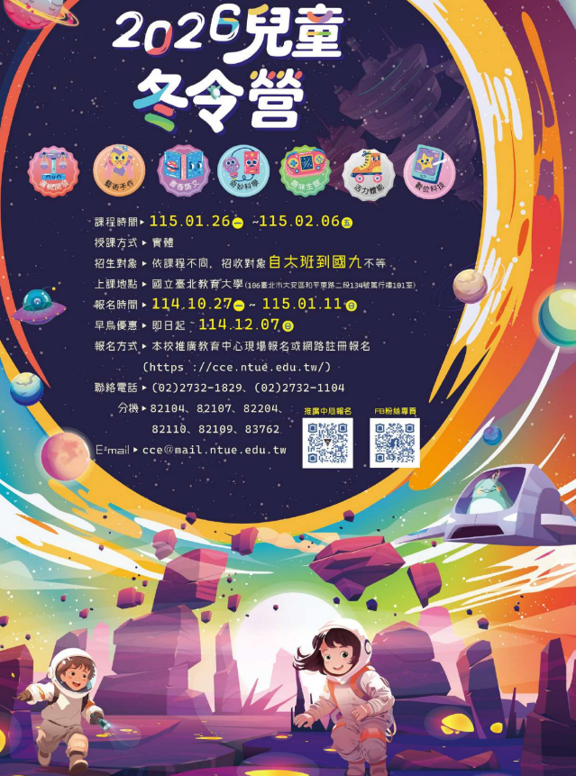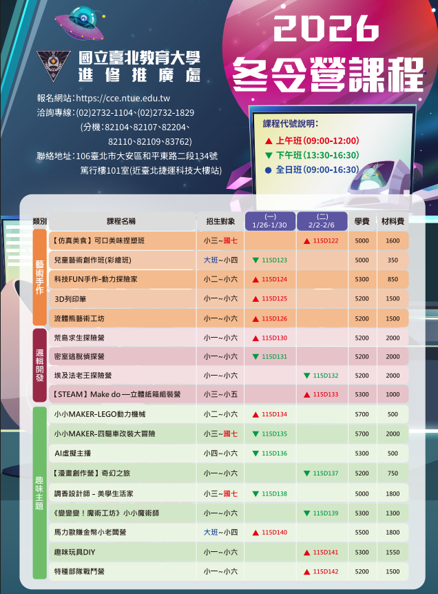課程詳細資訊請至該校進修推廣處推廣教育中心網站(https://cce.ntue.edu.tw/)查詢