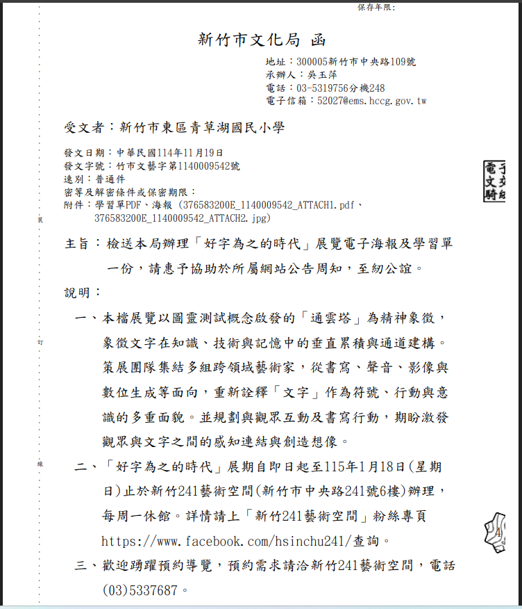 【轉知】新竹市文化局辦理「好字為之的時代」展覽,歡迎民眾前往欣賞參觀。(新竹241藝術空間)