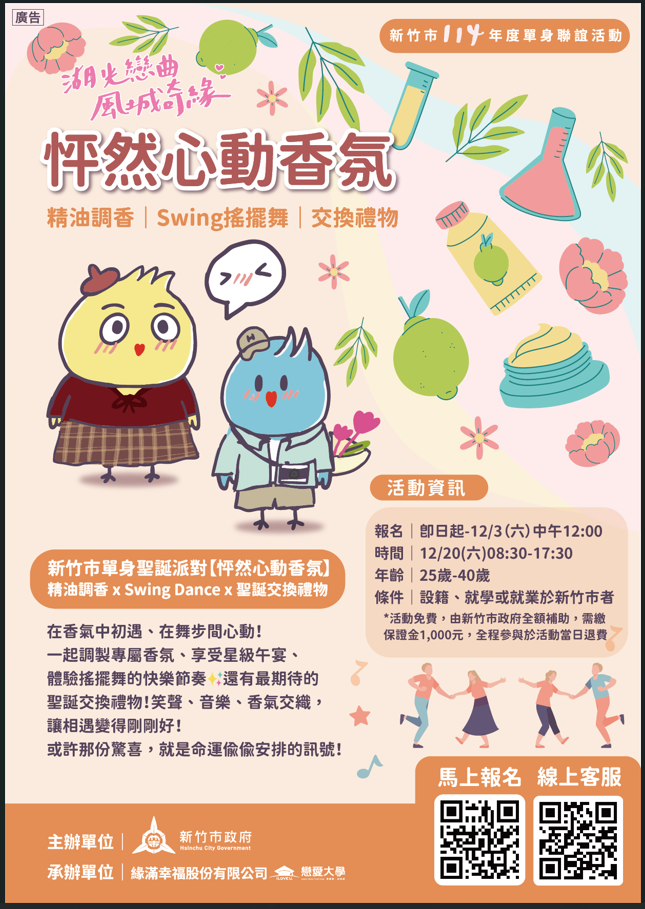 | 主旨: | 有關本府加碼辦理114年度第三場單身聯誼,活動主題為「怦然心動香氛」,自即日起至12月3日止受理網路報名,請協助宣傳設籍、就學或就業於本市單身民眾踴躍參加,請查照。 |