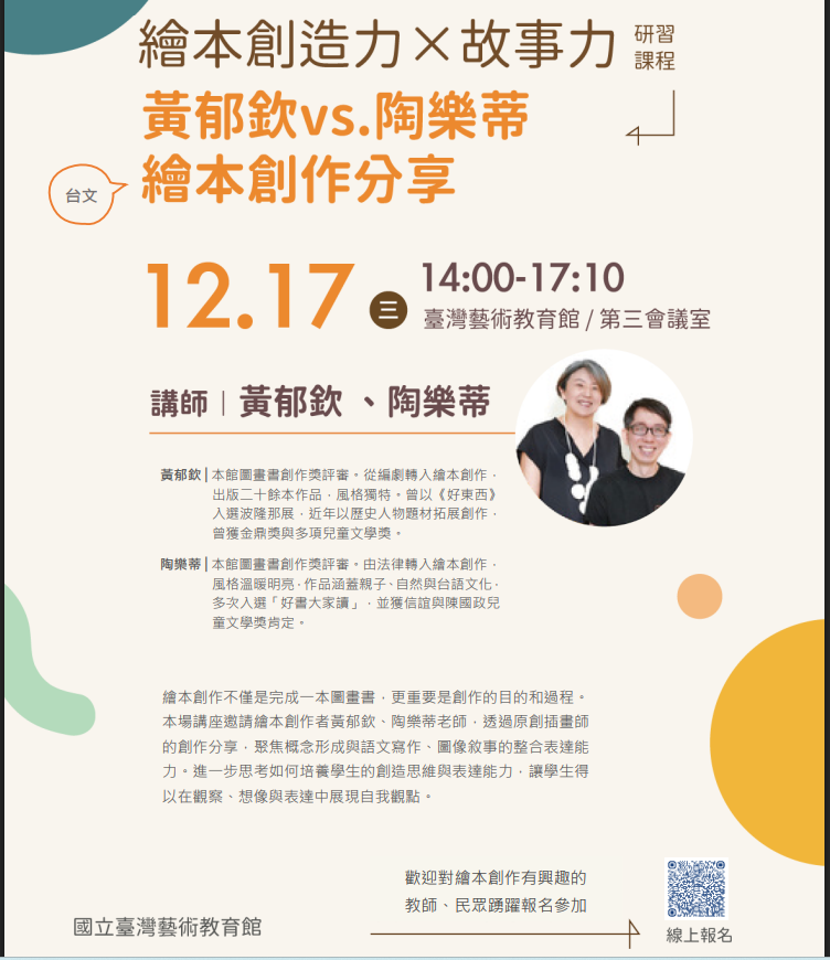 | 主旨: | 國立臺灣藝術教育館辦理「種活美感種子-視覺藝術教育深耕推廣計畫」之「繪本創造力×故事力(黃郁欽&陶樂蒂臺文繪本創作分享)—教師增能研習」,請查照。 |