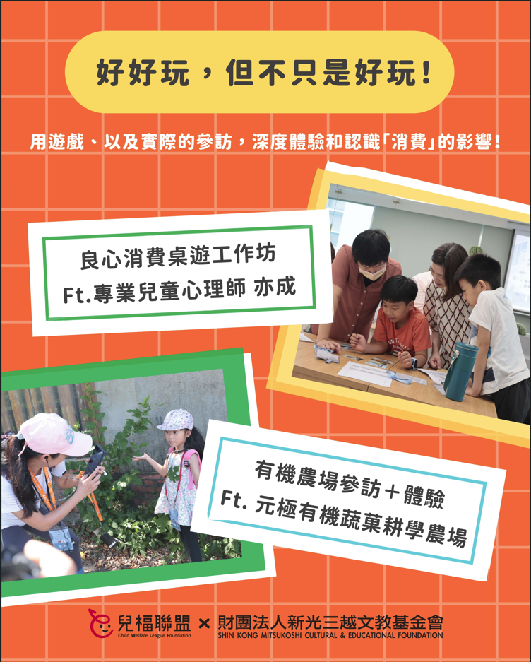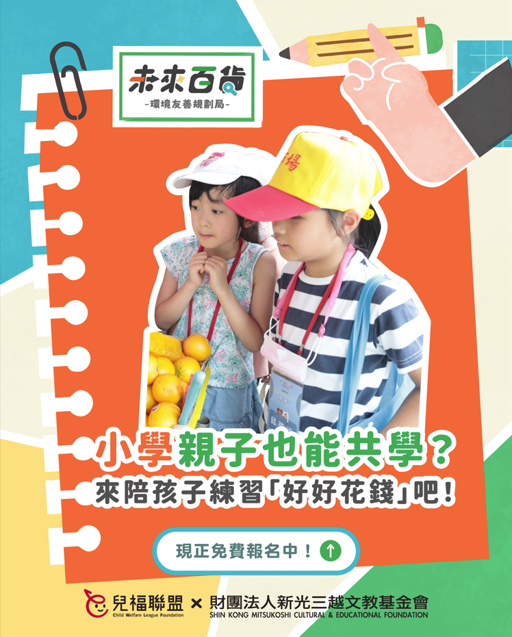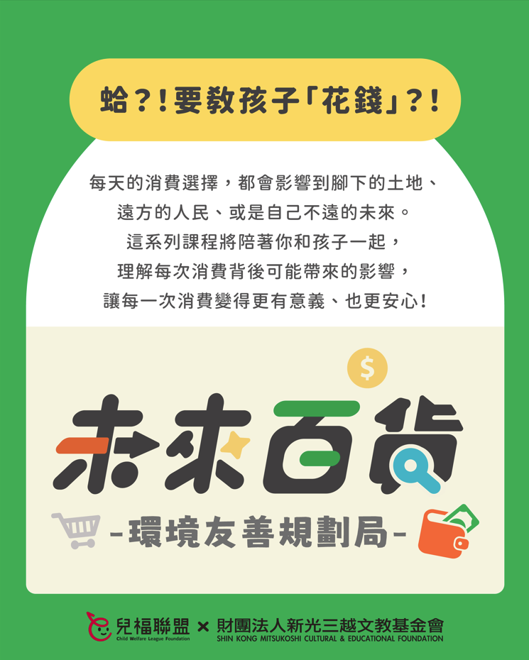 | 一、 | 為培養學童面對未來社會的獨立思考、溝通表達、永續素養等能力,並促進親子共學機會,本會辦理「新人類時光機:未來百貨-環境友善規劃局」系列課程,透過貼近生活、以遊戲和體驗為主的學習設計,引導孩子理解責任消費、環境保護等永續議題,練習整理觀點並付諸行動,以家庭、自身的生活為起點,為社會帶來良善的改變! |