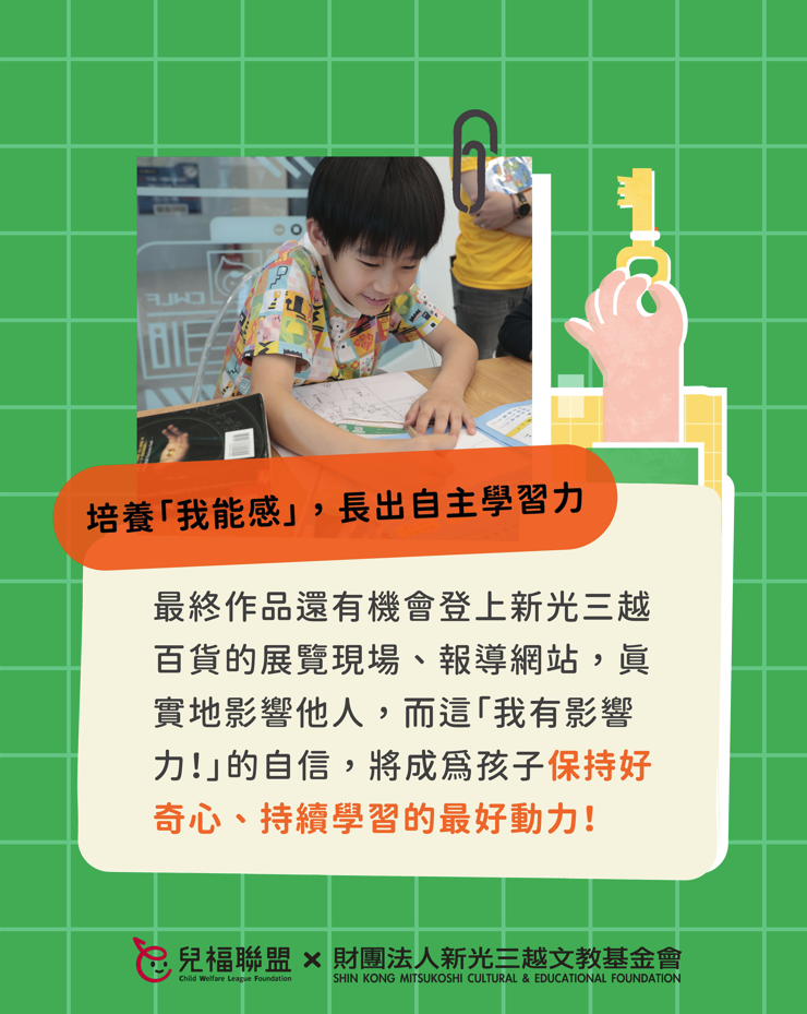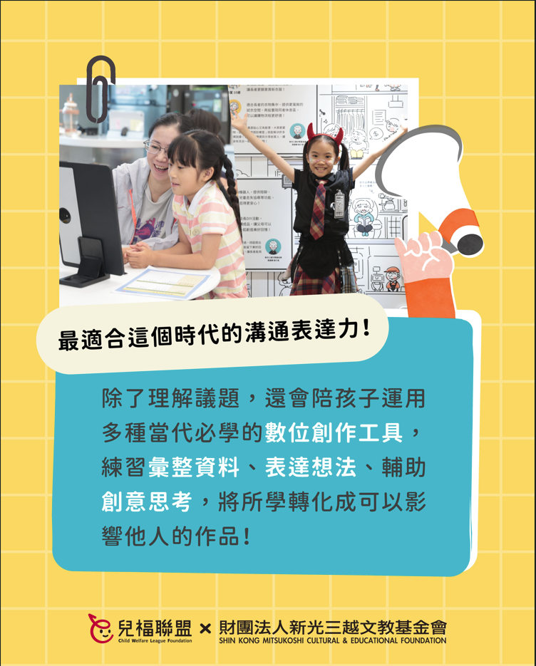 | (五) | 完整學習歷程:完整學習歷程:課程循序引導孩子經歷「理解議題→深入探索→付諸行動影響他人」的培力過程,強化自信與行動力,培養孩子的自主學習技巧及意願。 |
