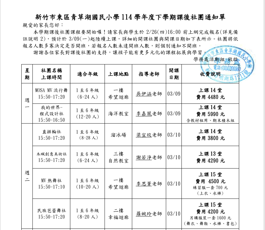 青草湖國小114學年度下學期課後社團報名相關資訊!