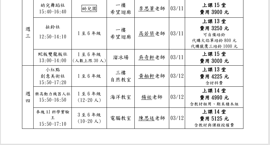 二、因為部分社團有開課人數限制,若報名人數不足無法開課,學校會另行通知學生與家長;若報名人數超過上限,則以報名先後順序決定學生名單。