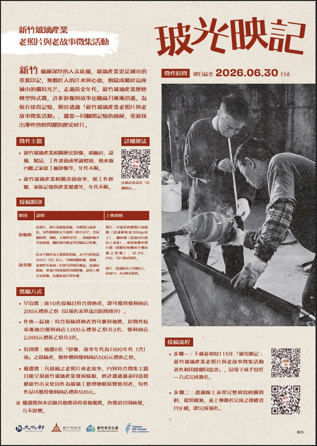 | 一、 | 為保存與推廣新竹玻璃產業發展歷史記憶,充實相關文史資料,廣邀民眾提供與新竹玻璃產業相關之歷史資料,共同見證城市產業發展軌跡。 |