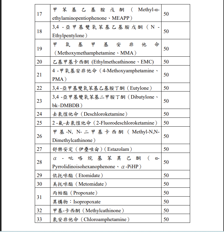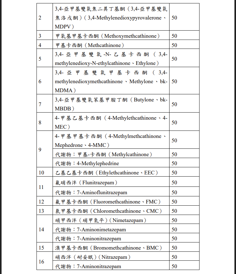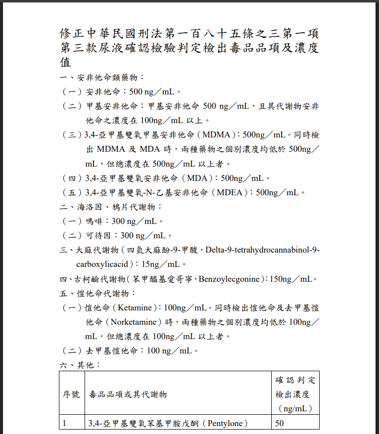 | 主旨: | 函轉行政院公告修正「中華民國刑法第一百八十五條之三第一項第三款尿液確認檢驗判定檢出毒品品項及濃度值」1份,並自115年3月6日生效,請查照。 |