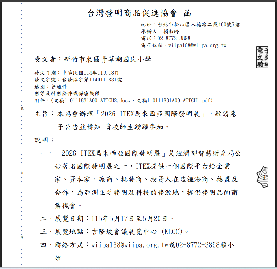 【轉知】台灣發明商品促進協會辦理「2026 ITEX馬來西亞國際發明展」,請民眾踴躍報名參加。