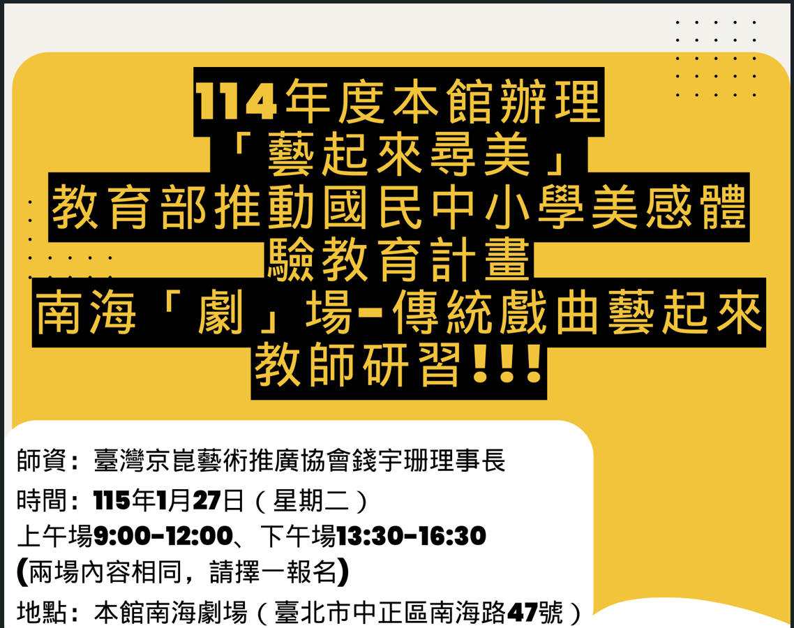 | 主旨: | 國立臺灣藝術教育館辦理114年度「藝起來尋美―教育部推動國民中小學辦理美感體驗教育計畫―南海『劇』場-傳統戲曲藝起來」教師增能研習,詳如說明,請查照。 |