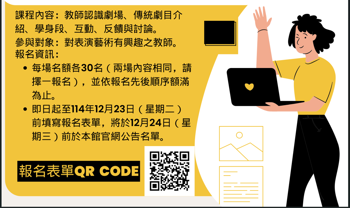 | (六) | 報名資訊:每場名額各30名(兩場內容相同,請擇一報名),並依報名先後順序額滿為止。即日起至114年12月23日(星期二)前逕至Google表單(https://forms.gle/EyUyeXvs6TGezmfE7)報名,將於12月24日(星期三)前於該館官網公告名單,每場次課程核予3小時研習時數,請事先上全國教師在職進修資訊網註冊,以利後續登錄研習時數。 |