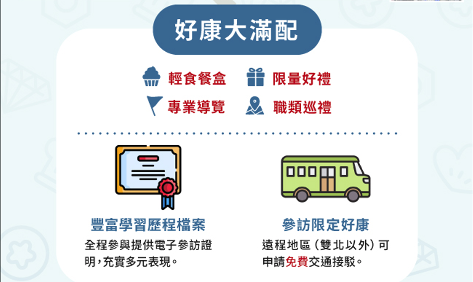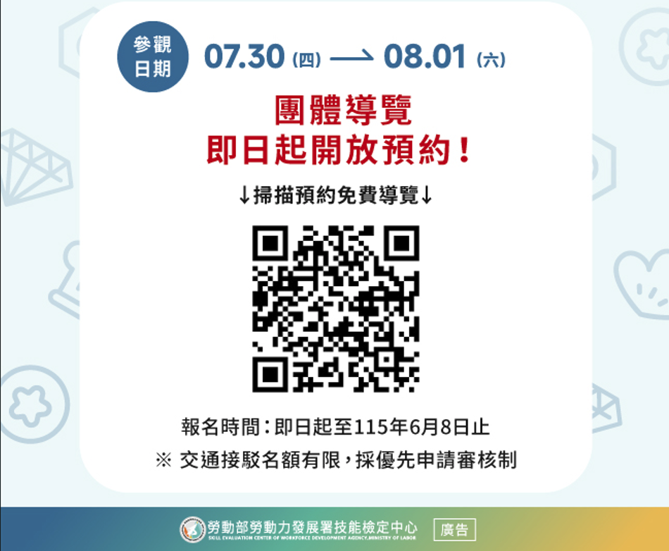 | 三、 | 旨揭競賽活動之競賽日程(7月30日至8月1日)歡迎各級學校師生踴躍參訪,安排學生戶外教學,師生一同蒞臨參觀,現場提供免費導覽(含外語)服務(申請網址:https://reurl.cc/jmj56p)、交通接駁及活動限量宣導品,期能強化技能教育、提升學習意識,以達到向下紮根之目的,並強化國際連結。 |