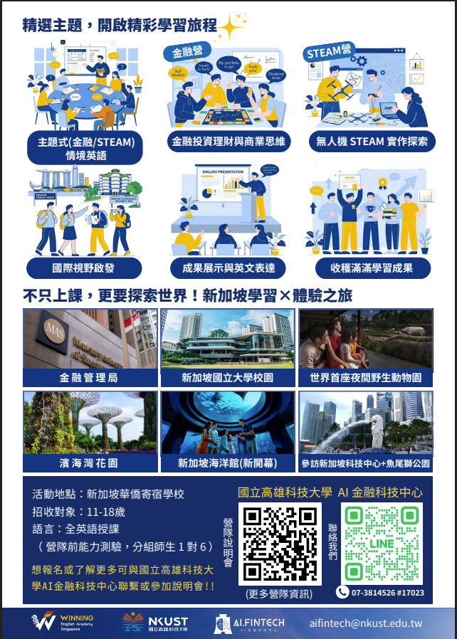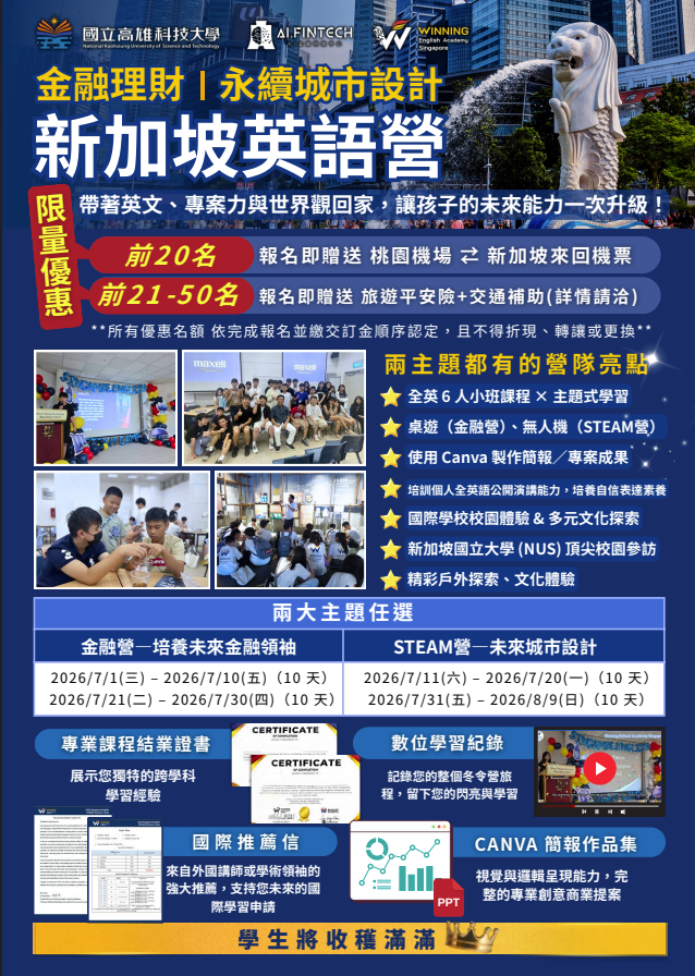 | 一、 | 為提升學生國際視野與英語實作能力,本校AI金融科技中心與新加坡WINNING English Academy合作,於115年暑假辦理「2026 WINNING English 新加坡夏令營」課程結合英語+金融素養及英語+STEAM專案設計,並融入跨文化交流與智慧城市探索,內容充實多元。 |