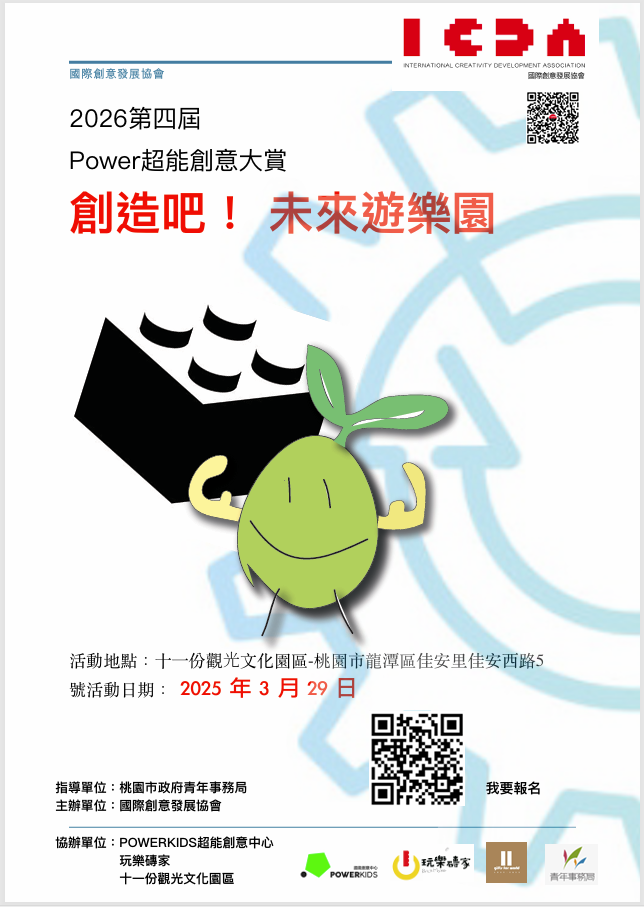 | 一、 | 國際創意發展協會為提升全國高中及國中小學科技教育創新和創意,特於民國115年3月29日星期日舉辦第四屆「2026Power超能創意大賞-全國創意賽、拼砌賽(積木造型賽)」,其目的在於透過全國創意賽與拼砌賽(積木造型賽),提升學生們對科技教育的興趣,激發創新與創意能力。 |
