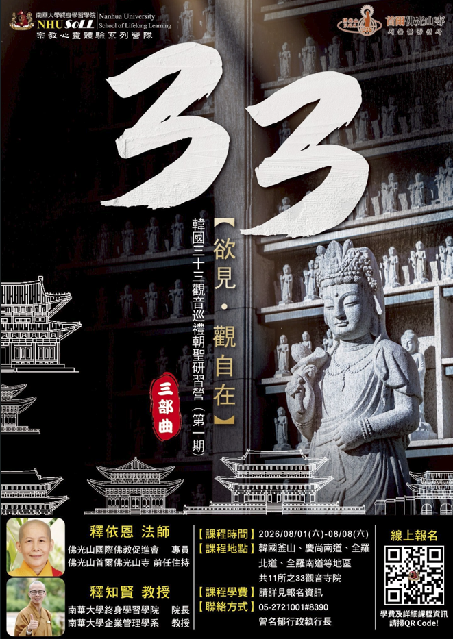 | 主旨: | 檢送本校開辦之【欲見‧觀自在】韓國三十三觀音巡禮朝聖研習營(第一期):三部曲課程資訊,敬請惠予公告及鼓勵貴單位同仁踴躍報名參加,請查照。 |