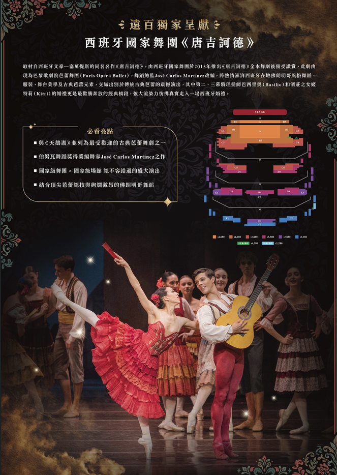 | (二) | 西班牙國家舞團自創立以來,歷經多位世界級藝術總監領軍,在古典與當代之間不斷拓展藝術疆界,兼具技術實力與文化深度。此次來台演出的《唐吉訶德》,更被視為舞團詮釋古典芭蕾語彙與西班牙民族精神的代表之作,充分體現其「以國家文化為根,與國際舞台對話」的藝術定位。 |
